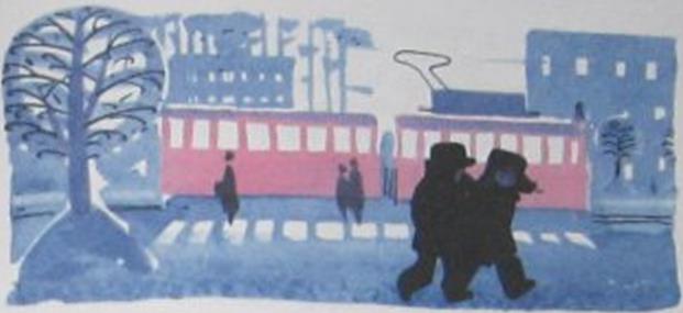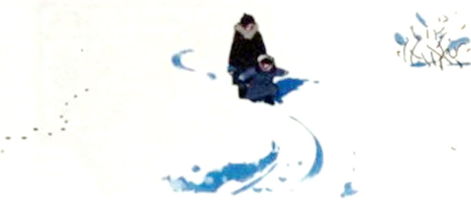 [3] протоптана узкая тропинка. Другая дорожка ведёт к соседнему дому и дальше. По ней идёт мама. Оглянулась. Улыбается Мише. Хорошо! Миша тоже улыбается под шарфом и спешит за ней. А идти с непривычки трудно: очень узкая тропка-канавка. Идешь, как по жердочке: равновесие надо держать. Чуть качнулся — и ногой в сугроб. Вытряхивай потом снег из валенка. А чуть поодаль, по той же дорожке, на трёх лапах идёт кот Матвей. Это у него от мороза такая походка. Миша догоняет маму и мычит: у них уговор — на морозе не разговаривать.