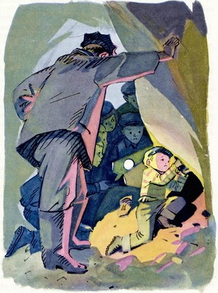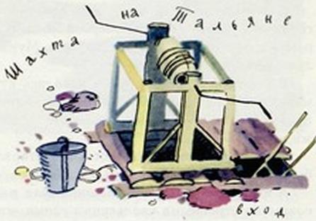 Ребята стояли у дощатого настила. Рядом темнел квадрат входа. Ручная лебёдка протянула свой трос куда-то вглубь. Лестница из толстых жердей почти отвесно вела под землю. Ребят разделили на три группы и начали спуск. Миша попал в первую очередь.