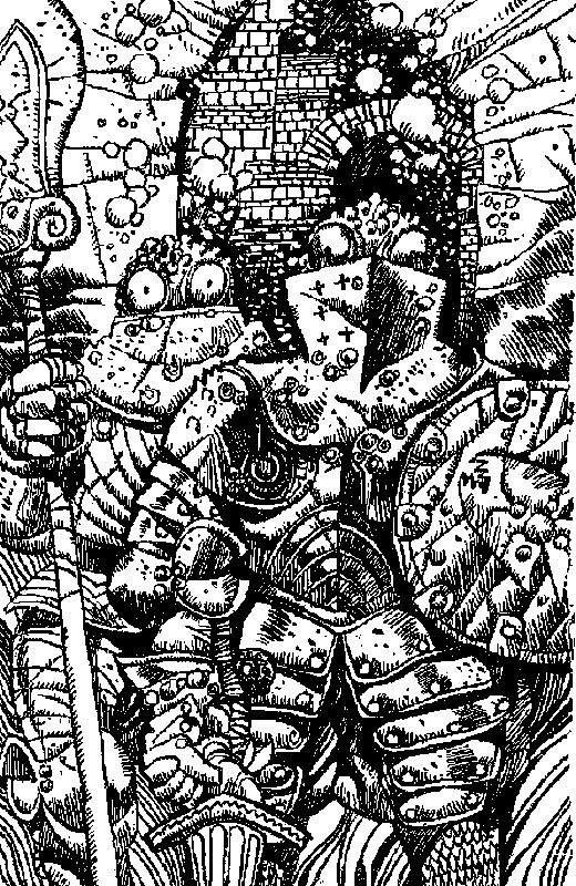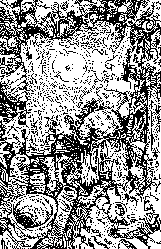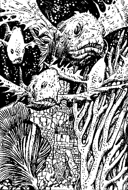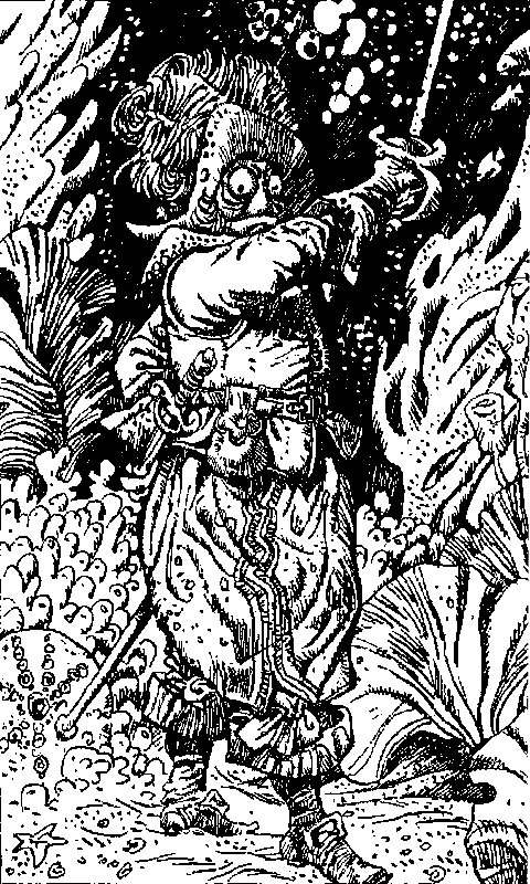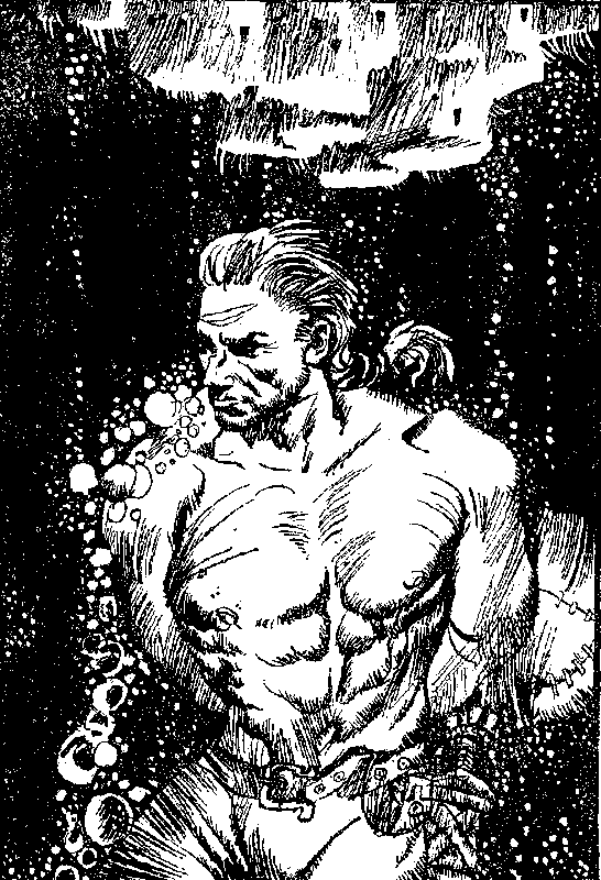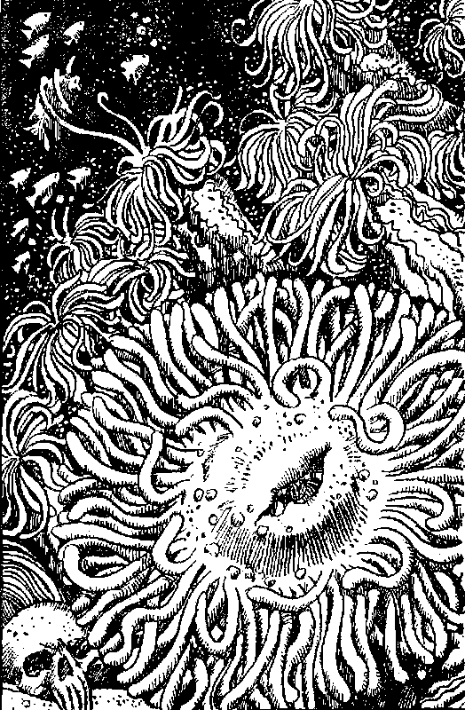 Воды океана смыкаются у тебя над головой. Из последних сил сдерживая дыхание, ты в отчаянии пытаешься освободить руки, но стягивающие тебя узлы вязали настоящие мастера своего дела. Ты погружаешься все глубже и глубже. Вокруг тебя вьются стайки любопытных рыбок, постепенно мир окрашивается в зеленые тона. В этом месте океан достаточно мелок, и ты уже можешь разглядеть высокие коралловые шпили, поднимающиеся со дна. Но что это?! Это не просто кораллы — это останки затонувшего города! Ты опускаешься в самый центр некогда величественного внутреннего двора; сейчас он полностью зарос морскими водорослями и кораллами. Ты больше не в силах сдерживать дыхание — последние остатки воздуха огромным пузырем вырываются у тебя изо рта и быстро поднимаются на поверхность. Как только твои ноги касаются твердой поверхности, вокруг начинают пробегать всполохи странного белого света. На каменном полу внутреннего двора начертана гигантская пентаграмма, и волею судеб ты опускаешься прямо в ее центре! Но у тебя нет времени разбираться в происходящем: если ты немедленно не всплывешь на поверхность, то менее чем через минуту будешь мертв! Однако вес твоего заплечного мешка и висящий на поясном ремне меч надежно удерживают тебя на дне, и тебе не удается разорвать стягивающие твои руки веревки. Последние силы покидают тебя, и холодная морская вода врывается в твои легкие. Но что это?! Ты все еще жив! Немного придя в себя, ты понимаешь, что волшебная пентаграмма спасла тебя от неминуемой смерти. С трудом преодолевая сопротивление толщи воды, ты подходишь к ближайшему коралловому кусту и его острыми ветками разрезаешь связывающие тебя веревки. Странное ощущение в области горла заставляет тебя вытащить меч и всмотреться в собственное отражение на его сверкающем клинке. Ты видишь, что у тебя выросли жабры! Теперь ты, как рыба, можешь дышать под водой! Ты видишь, что твой мешок с провизией также не пострадал. Чудесное волшебство пентаграммы уберегло лежащую в нем снедь он разрушительного воздействия соленой воды.