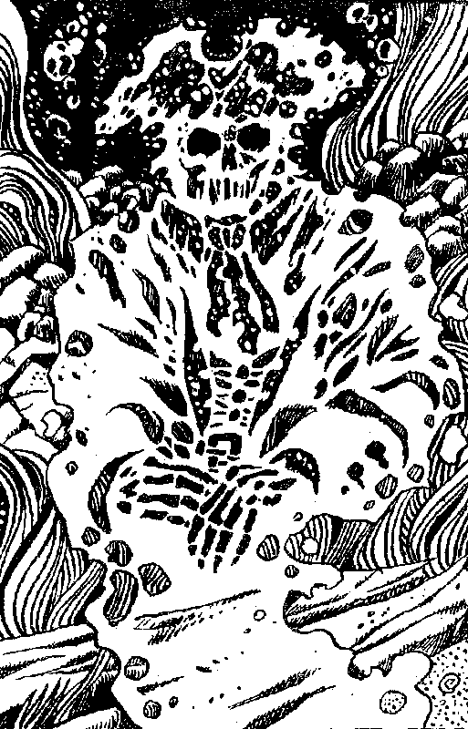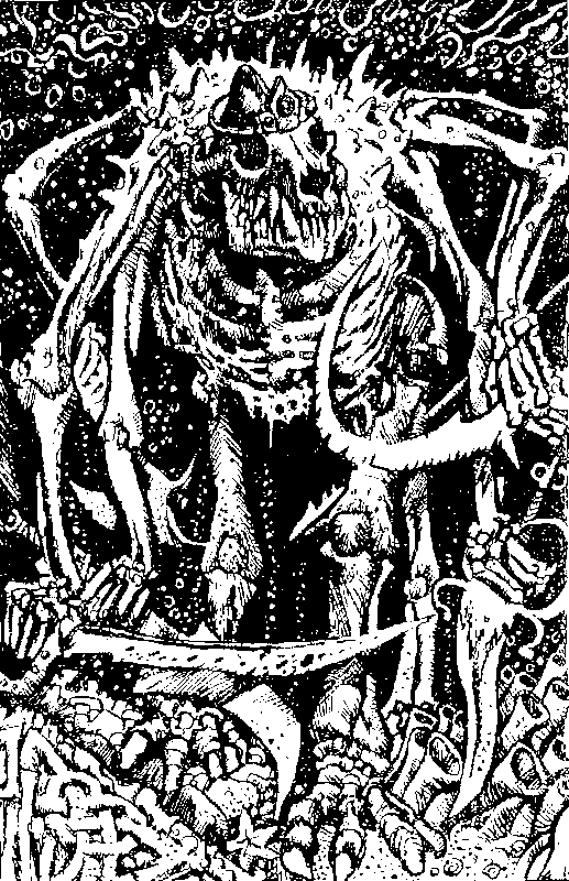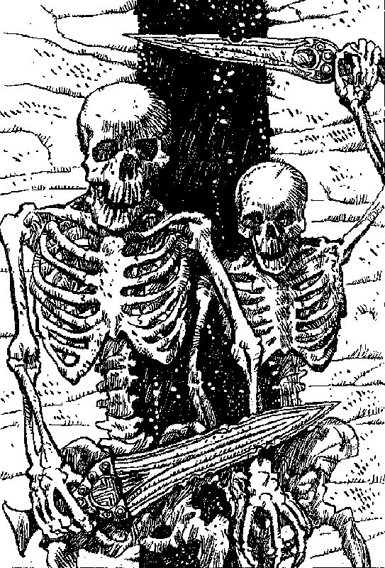 Ты стремительно бросаешься к темнеющему в потолке комнаты отверстию, однако Костяной Демон оказывается проворнее — его ржавое копье вонзается тебе в спину и стаскивает тебя вниз. Ты чувствуешь, как неимоверно сильные костяные пальцы стискивают тебя и подносят к оскалившейся сотней острейших акульих зубов пасти. Это последнее, что ты чувствуешь, да это, наверно, и к лучшему — ибо Костяной Демон откусывает тебе ногу и начинает поедать ее! Твое приключение на этом окончено!