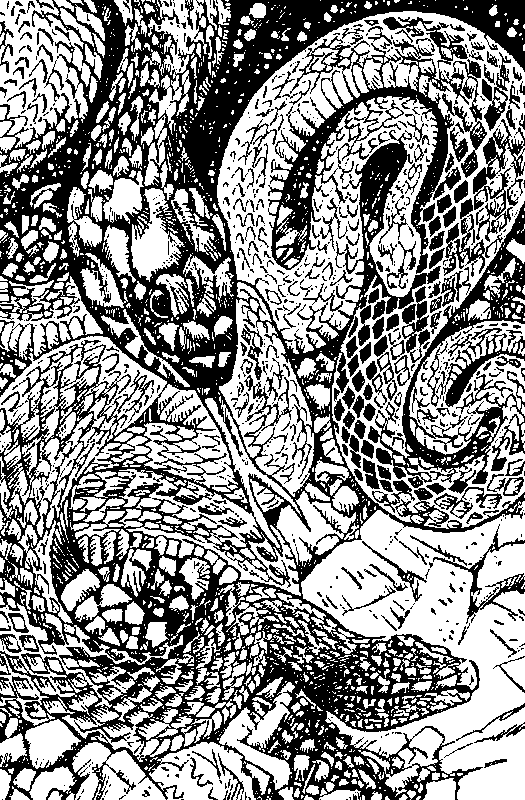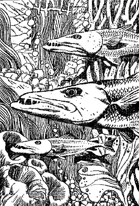 Ты проворно всплываешь вверх по ступеням и оказываешься на лестничной площадке. Широкий проем, когда-то закрывавшийся давно уже сгнившей дверью, приводит тебя в заваленную раковинами и увитую водорослями просторную комнату. Навстречу тебе кидается какая-то серебристая тень… и еще одна, и еще! Комната — логово трех гигантских барракуд — тонких серебристых рыбин длиной со взрослого человека. Кажется, что они состоят лишь из пылающих холодной яростью глаз и оскалившихся острыми как иголки зубами разинутых пастей. Прожорливые твари кружат вокруг тебя. Тебе придется сразиться с ними. Прижавшись спиной к стене, ты ожидаешь нападения.