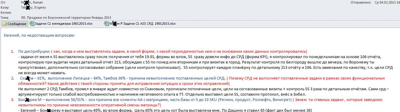 Данные по Туле и МО – молодцы (1 и 2 письмо) – продали 15 и 8 mio. 3 письмо обратная связь для меня – перевыполнение плана и объём в 47 mio – не оценивается – а оценивается дистрибуция по Максим 25 (придраться больше не к чему было). При этом невыполнение создано – игнорированием моих запросов и информации (см письмо 4 и 5)».