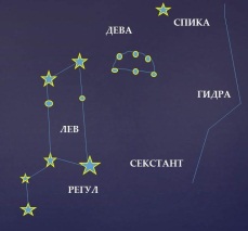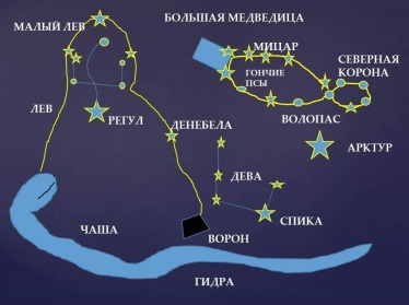 На звёздном небе созвездие Льва так и находится – рядом с созвездием Девы, а у Девы, действительно, лежащие у головы звёзды образуют абрис чаши: