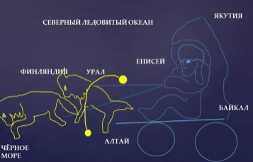 От него идёт «кол» (игла) к глазу зайца в центре Азии: