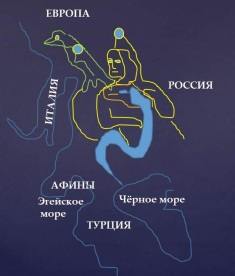 Приведу ещё одно доказательство владения тайными знаниями А.С. Пушкина: вспомним «Песнь о Вещем Олеге», где воин Олег получает смерть от змеи, выползшей из черепа его любимого коня, как и предсказал ему старец. На рельефе Земли, там, где находятся Эгейское и Чёрное моря, есть изображение воина с мордой коня на груди, в шею которых впивается змей: