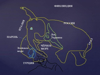 Здесь виден огромный слон, хобот которого заканчивается на городе Амасия Турции. На макушке огромного слона, хвостом заходящего на Урал, сидит тот самый сокол Вещего Олега (по моим данным, полученным по надписям на мегалитах, это – Георгий Победоносец). На рельефе Турции виднеется изображение девушки с высокой причёской, увенчанной вазой, которая может быть символом весны. Над чёрным морем, на рельефе Украины лежит Лев (если смотреть с севера):