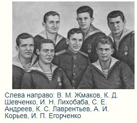 Слева направо: В. М. Жмаков, К. Д. Шевченко, И. Н. Лихобаба, С. Е. Андреев, К. С. Лаврентьев, А. И. Корьев, И. П. Егорченко