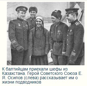 К балтийцам приехали шефы из Казахстана. Герой Советского Союза Е. Я. Осипов (слева) рассказывает им о жизни подводников