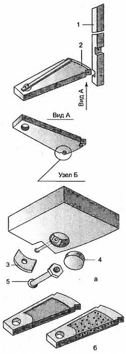 а — косоур с кобылками; б — крепление проступи с подступенком; 1 — косоур; 2 — шкант; 3 — кобылка; 4 — соединение шурупами впотай; 5 — то же, в паз; 6 — то же, с деревянной треугольной рейкой; 7 — то же, на стальных крепежах; 8 — столярный клей