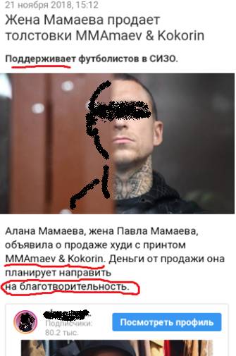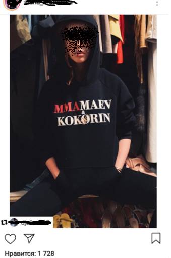 Читаю. Значит, жена поддерживает мужа, который, естественно незаслуженно, сидит в СИЗО. И по тексту: «..жена …, объявила о продаже худи с принтом «ММАmaev and Kokorin». Деньги от продажи она планирует направить на благотворительность». Далее фото, я так понимаю, жены в толстовке с этой надписью. При этом ММА выделено красным цветом. Так, интрига сохраняется, причём здесь ММА? И появляется ещё загадка, какая это такая «благотворительность» поможет парням в СИЗО? Так как новость на этом заканчивается и вложены только скрины из Инстаграмм, решаю посмотреть на указанной страничке, возможно, все ответы там. Страница доступна всем желающим, поэтому можно показывать. Захожу: