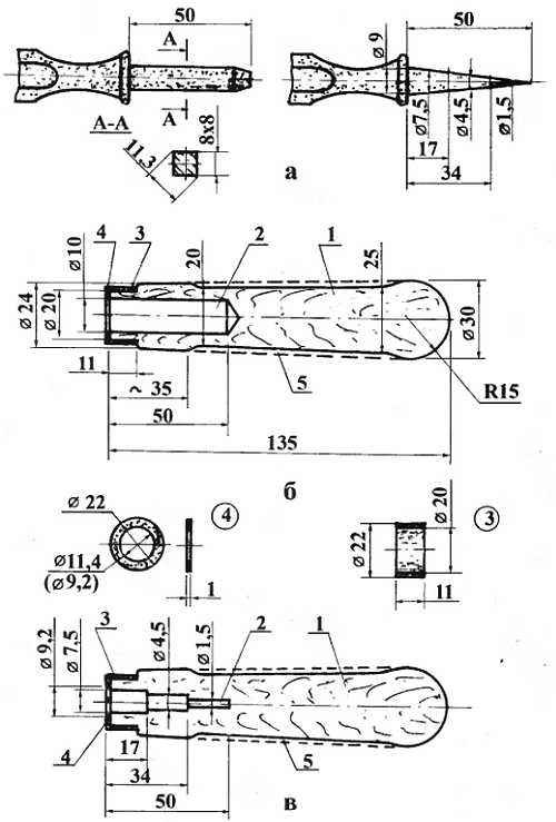 г) — круглого или овального сечения и с заостренной вершиной — идут в дело при разработке сильно свалянной шерсти, которую отсортировали от остальной как свалки или свалянные руна. Изогнутые колки разрывают, растаскивают такую шерсть, однако с существенными потерями в качестве: чуть ли не все волокна рвутся, средняя длина их становится много короче, чем в пласте.