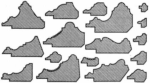 Колки и колковая гарнитура. Что случится с шерстью в трепальном агрегате, можно знать заранее. На результат рыхления и трепания влияет форма колков, их размер, частота размещения. Конфигурацию колков подбирают по способности волокон противостоять силе (профессиональный термин — абсолютная разрывная нагрузка). Одновременно берут в расчет степень плотности клочков, проще говоря, учитывают, как сильно они сваляны. Форм колков существует множество (рис. 56). Самые ходовые из них — четырех разновидностей: прямые (цилиндрические, конические, граненые) и изогнутые.
