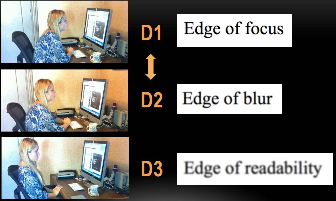 • Не следует читать в минусовых очках если вы видите на расстоянии более 15 см от экрана компьютера, если расстояние меньше, то минусовые очки должны быть такими, чтобы D2 было не более 100 сантиметров.