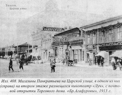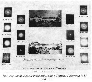 Затмение в аналогичном виде наблюдалось в Тюмени и Туринске. В Тюмени местный фотограф попытался снять все фазы затмения на фоне города с крыши здания по улице Царской, что напротив клуба приказчиков (илл. 222). Как можно предположить, основываясь на категорическом запрете, помещенном на фотографии («Копировать воспрещается»), автор неплохо заработал на распространении снимка...