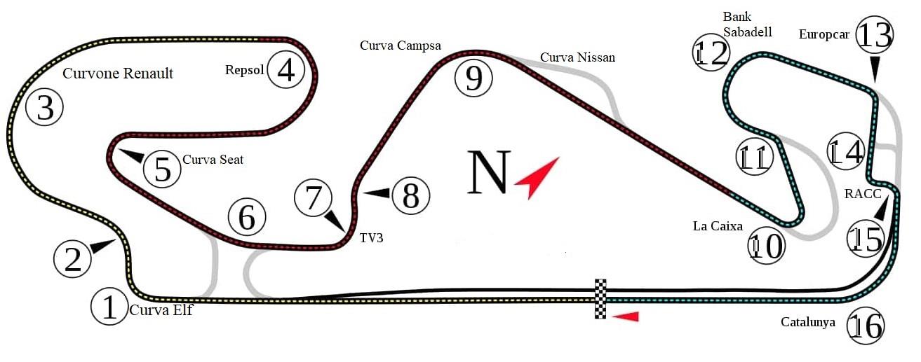 Шикана, затем длинная дуга «Рено», прямой отрезок, конец первого сектора. Проехать по инерции чуть дальше, резко вправо — короткая синусоида траектории на входе в дугу «Репсоль»; небольшой спуск — и притормозить перед шпилькой «Сеат». Аккуратно пройти кривизну малого радиуса… теперь разгон… есть сотня кэмэ. Малость сбрасываю перед шиканой «ТВ3», спрямляю по поребрику. Поднажать… Сцепление уходит — вильнуть змейкой, подогревая резину; следом — пологий «Курва Кампса» и полукилометровый прямик.