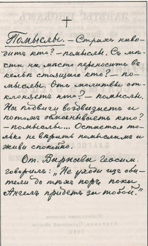 Схимонах Зосима Верховский: «Хотящий без откровения своих помыслов жить, много борим бывает, и рождаются в нем разновидные страсти. Враг, ведая, как пагубна скрытность, зельно борет и нудит подвижника, да живет без откровения; сложився же с таковым вражиим всеянием, заблуждается душою и мнит право и безгрешно жити при наставнике, сице неистинствуя и утаивая, и того ради не ощущает покоя и утешения в душе своей, ибо без веры и любви живет при своем отце; отчего побеждается роптанием, и презорством, и осуждением и негодованием, и немирствием; и сии недуги душевные, усилясь скрытностью, делают жизнь при отце несносною и доводят до того, что таковой оставляет и братство и, увлеченный своею волею и своим мудрованием, заблуждает от правого пути святыми отцами преданного» (Поучения схимонаха Зосимы Верховского, гл. 2, об откровении).