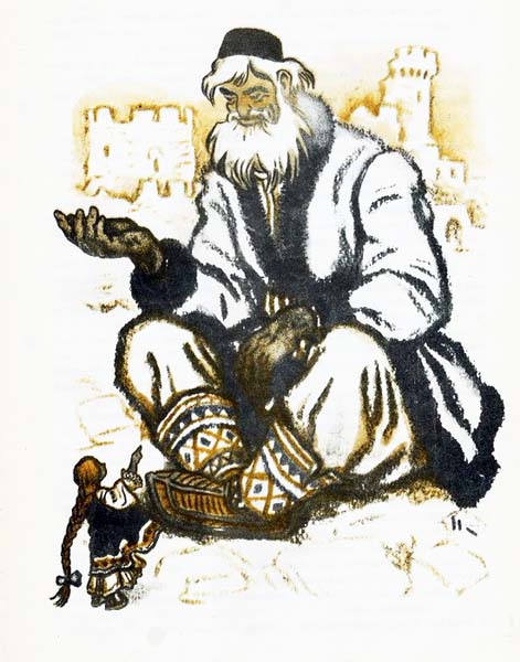 Шла Косенка, шла и пришла к самой толстой стене. Тут она повернула за угол и видит: спит под стеной огромный человечище. Был он больше самого большого дуба в самом большом лесу. На нём был сермяжный кафтан, подпоясанный ремнём в пять саженей. Голова с целую бадью, а борода, точно стог кукурузы.