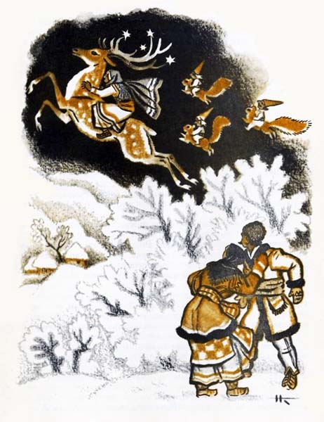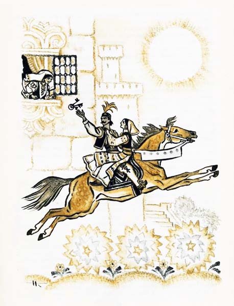 Но Косенке казалось, что он едва плетётся. Пригнулась она к коню и дёрг его за правое ухо. Взвился конь в самое небо, вырвался из табуна и понёс Косенку неведомо куда.