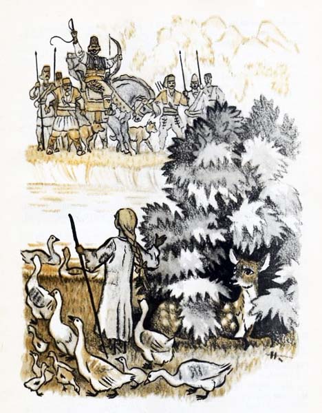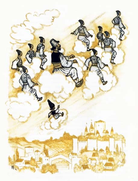 Понравилась им прекрасная Косенка, вынули они её из корзинки, повели на самый лучший луг и стали любоваться её чудесным платьем, мягким и сверкающим, словно утренний свет. А от волшебного покрывала просто глаз отвести не могли — ведь на нём можно было летать над полями и лугами и под самыми облаками.