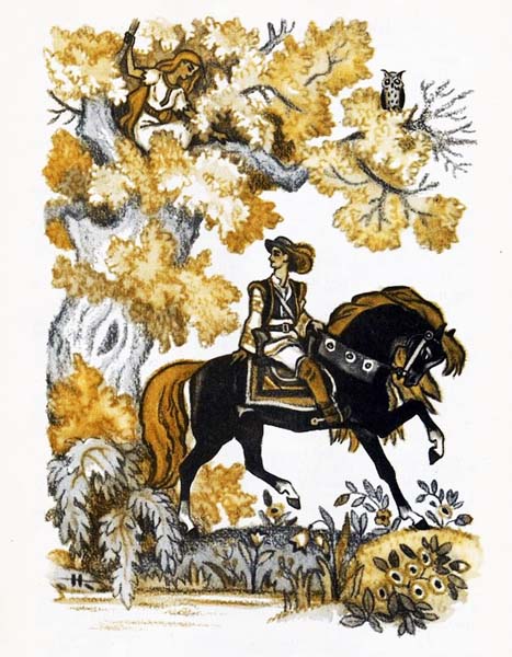 Младшая из них, Косенка, первый раз ступила на землю. Носится она по лугу так, что дух захватывает, и всё сильнее погоняет скакуна золотой косой. А конь ей достался самый резвый. Собой невелик, но злой как чёрт. Бежит вороной — земля дрожит, из очей пламя пышет, из ноздрей дым валит.