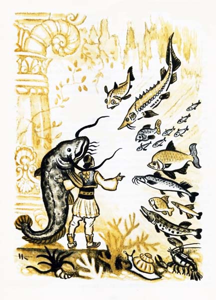Наплакавшись вдосталь, нашли они жемчуг и двинулись в путь; но теперь уж Косенка ни до чего не дотрагивалась: ни до затонувших кораблей, набитых всякими сокровищами — каким-то чудом попали они сюда с морского дна, — ни до красных кораллов, ни до жёлтого янтаря, что лежал возле подземных столбов. Ни до чего не дотрагивалась Косенка, и Регоч нигде не останавливался, а всё шёл да шёл, чтоб поскорей дойти до золотых полей.