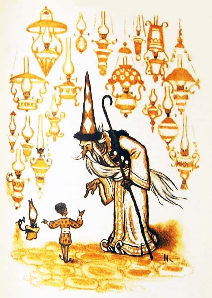 Косенка поняла, что ей нет спасения, и перестала плакать. «Слезами горю не поможешь», — подумала она и решила достойно встретить смерть. Надела она на голову драгоценную корону, взяла в руки палочку слоновой кости и легла, чтоб умереть. Подле неё стоял фонарик, который сиял так ярко, словно золотом горел.