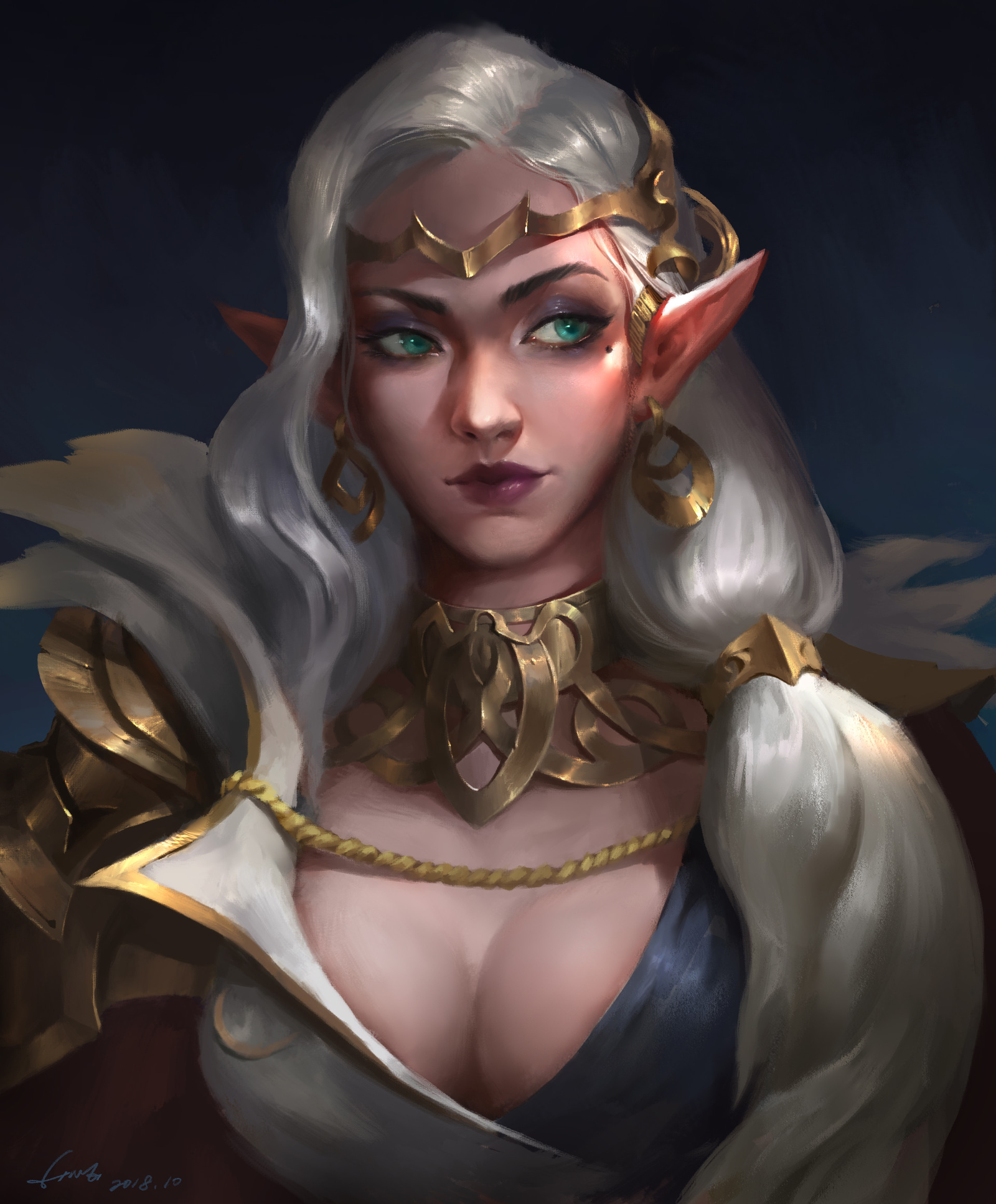 Девушка была среднего роста. Точеную фигуру, будто ангелы лепили. Стройные ноги, аппетитная попка, тонкая талия и высокая, упругая грудь. Наряд, чем-то напоминающий обтягивающий комбинезон без рукавов, украшенный голубыми драгоценными камнями, металлическими вставками и ремешками, подчеркивал все достоинства фигуры. На плечах у эльфы были широкие браслеты, из материала внешне похожего на деревянные пластины, которые держались за счет металлических заклепок. Из-под левого, по бархатистой коже, расползалась татуировка с каким-то мифическим зверем, отдаленно похожим на водного или небесного дракона. Все-таки эльфы странные. Терпеть нас не могут, но тату с нашим изображением на свое тело наносят. Где логика? Не понятно! Длинные, каштановые волосы, заплетенные в тугую косу, были украшены, своего рода, драгоценной паутиной из золотистых бусин, колечек и полумесяцев. Заостренные ушки поблескивали многочисленными сережками. Но больше всего сердце замирало при взгляде на лицо девушки. Слегка заостренные черты лица, чуть пухловатые соблазнительные губы, аккуратный носик, тонкие дуги бровей и невероятно выразительные, подведенные черным, серые глаза, в которых словно плескалось расплавленное золото. Изящным дополнением облика являлся золотистый витиеватый узор на левой скуле. Вау, как шикарно! Может, взять ее с собой не такая уж и плохая идея?