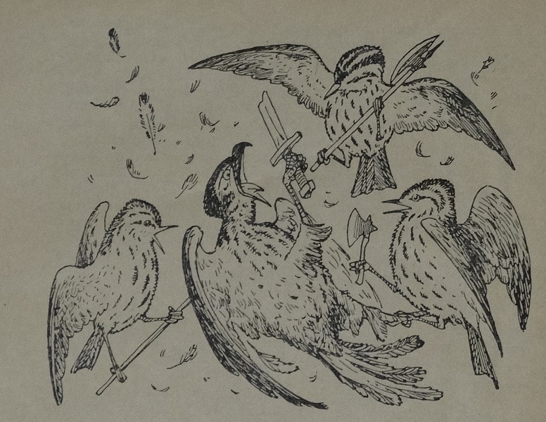 Много было радости, когда возвращались они на свои болота, на весёлые лиственные опушки, к родным дуплам и знакомым кустам. Тут журавли принимались плясать, козодои хлопать крыльями, кукушки смеяться, стрижи и ласточки носиться в воздухе, а мелкие птички насвистывать звучные песни.