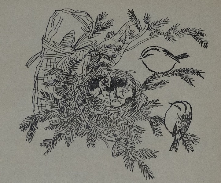 Мелкие синички с рассветом поднимаются. Едва посветлеет восток, они уж копошатся в вершинах сосен, ищут тлей, пауков, букашек. Так целый день: от дерева к дереву, от кустика к кустику. Нашёл корм - сыт и весел, не нашёл - ослаб и замёрз. А к вечеру, сбившись стайкой, они садятся тесно рядом, чтобы потеплее. И спят, прикрывая друг друга крылышками, всю долгую, морозную ночь.
