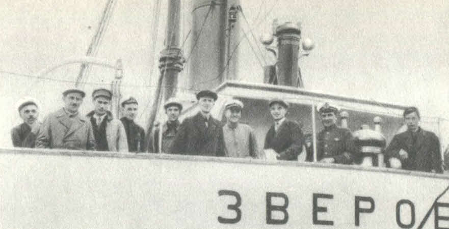 Б. Г. Чухновский (второй слева) и его экипаж — Г. А. Страубе (четвертый), А. Д. Алексеев (седьмой) и А. В. Шелагин (девятый) на борту промысловой шхуны «Зверобой» во время проводки судов Карской экспедиции. Пясинский залив, Карское море. Лето 1929 г.