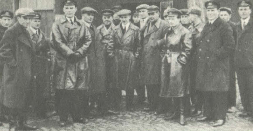 На ленинградском судостроительном заводе, где создавался самолет Б. Г. Чухновского «Дальний арктический разведчик» (ДАР). Летчики, инженеры и рабочие цеха. Среди летчиков — С. А. Леваневский (четвертый слева) и Н. П. Каманин (шестой справа). 1934 г.