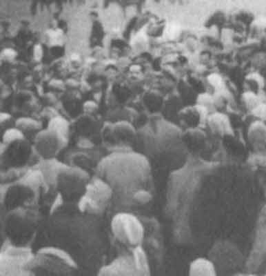На привалах партизан окружали местные жители. Митинг в селе Старая Гута Тернопольской области. Комиссар С. В. Руднев (в центре) выступает с речью. Июнь 1943 г.