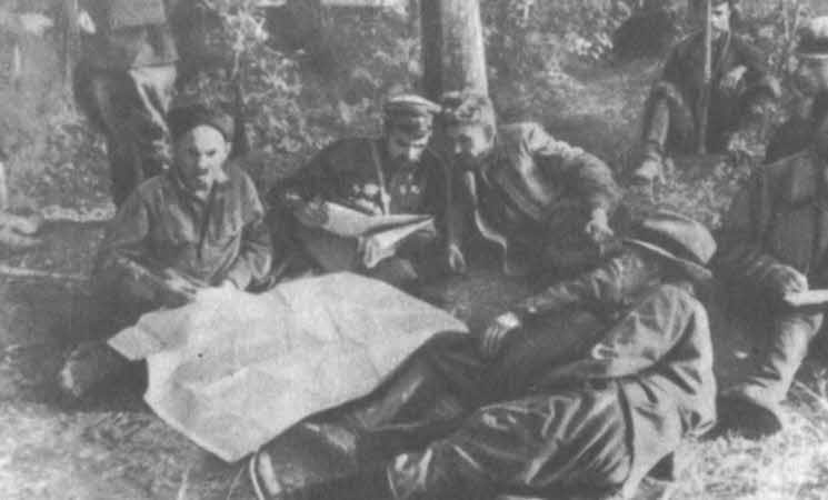 Группа партизанских разведчиков собралась на боевое задание. Комиссар С. В. Руднев (сидит) беседует с ними. Справа от него стоят заместитель командира соединения по разведке П. П. Вершигора и секретарь партбюро Я. Г. Панин.