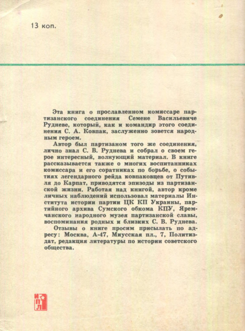 П14 ПАРТИЗАНСКИЙ КОМИССАР. (О Герое Советского Союза С. В. Рудневе). М., Политиздат, 1972. 128 с. с илл. (Герои Советской Родины).