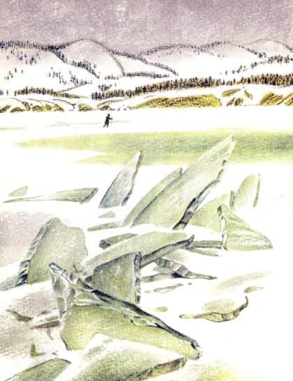 Но вот закружилась позёмка, потащило ветром снег по реке, и зазвенели тонкие льдинки, сдерживая порывы ветра; возле них, как у щитков, образовались сугробы.
