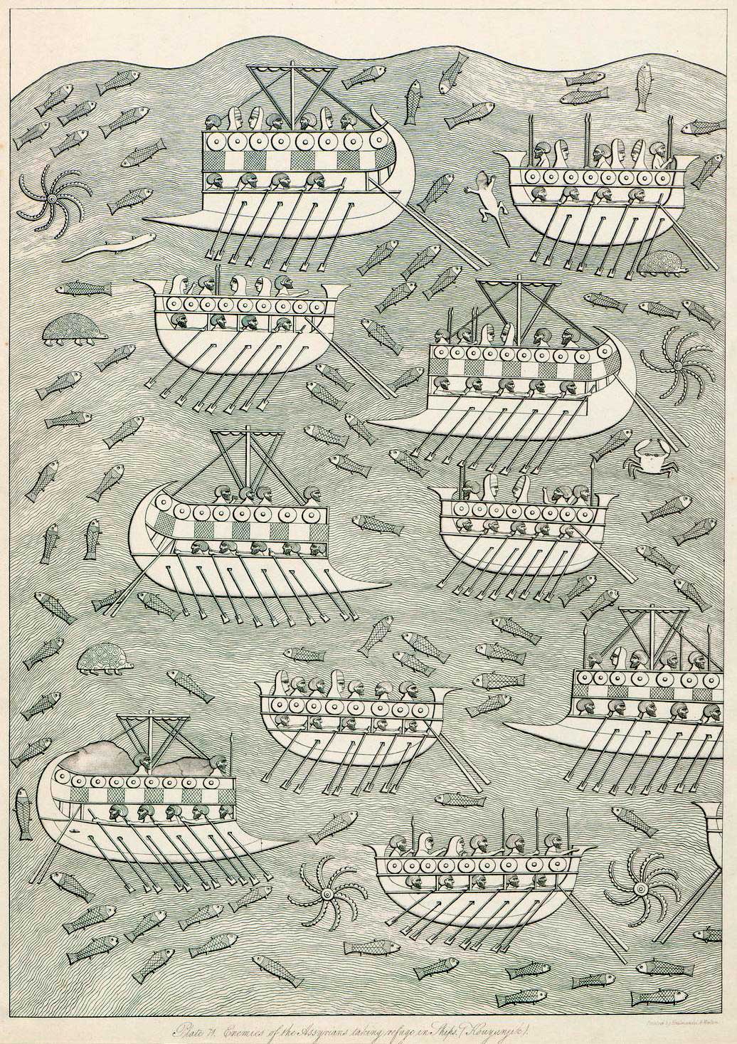 Финикийские суда; некоторые с оснасткой и приспособлением для тарана. Ассирийский храмовый рельеф времен Скнахериба (705–681 гг. до н. э.)