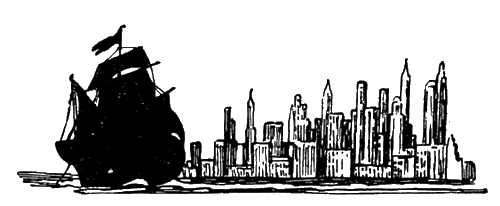 В это время каравеллы уже входили в гавань. Осень в этих широтах была прекрасная. Светило солнце, и чайки кружились за кормой. Глубоко взволнованный, Колумб вступил на новую землю, держа в одной руке скромный пакетик с бусами, которые он собирался выгодно обменять на золото и слоновую кость, а в другой — громадный испанский флаг. Но куда бы он ни посмотрел, — нигде не было видно земли, почвы, травы, деревьев, к которым он привык в старой, спокойной Европе. Всюду были камень, асфальт, бетон, сталь.
