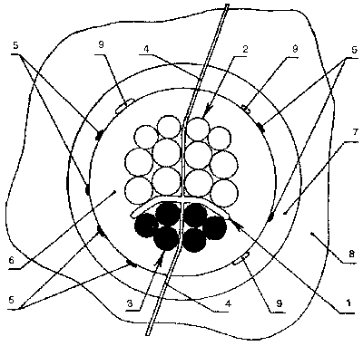 5 — относительно небольшие структуры горячего компактивизирующего первичного черного эфира, находящиеся у поверхности солнечной «фотосферы» (поз.6) и периодически [в основном вследствие магнитного воздействия структур (поз.9)] всплывающие на ее поверхность, проламывая твердую кору жидкой оболочки (поз.6), или «солнечные пятна»;