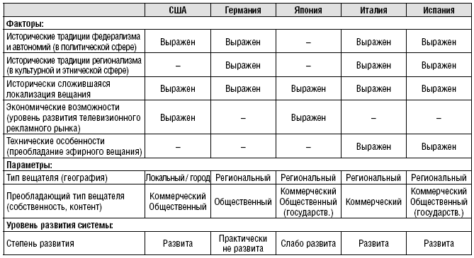 Итак, анализ практики зарубежных телевизионных систем показал, что для формирования в них заметной группы эфирных региональных/ локальных телевизионных каналов, в том числе и полновещательных, необходимо сочетание нескольких факторов. Влияние их может быть косвенным, но все же оговорить его необходимо (см. табл. 1).