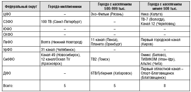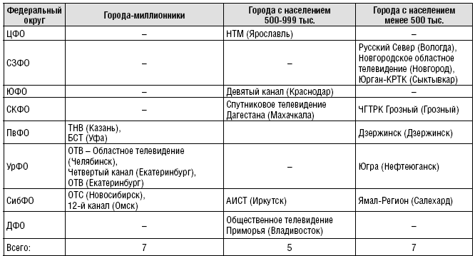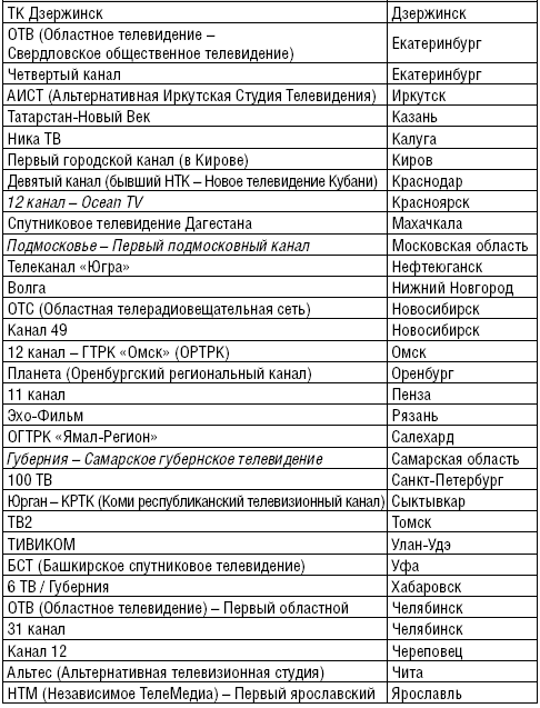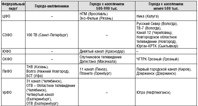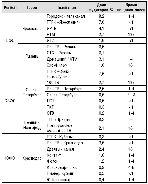 IPTV (проектов телекоммуникационных операторов по предоставлению услуг доступа к телеканалам через интернет-протокол) создали инфраструктуру для появления большого числа локальных каналов. Например, в США работают почти 100 местных кабельных каналов, посвященных локальным новостям и региональному спорту. Десятки кабельных провинциальных и городских каналов работают в ФРГ, Италии, Испании. Растет число городских кабельных каналов и в России. Однако подчеркнем, что в рамках этой книги в поле нашего интереса попадают только системы эфирного наземного вещания, поэтому за пределами исследования осталась большая группа российских региональных кабельных каналов.