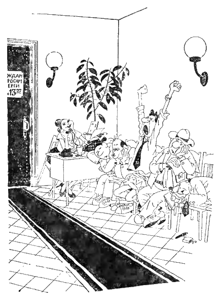 И начинается великое сидение, так что даже и немнущиеся ткани дают слабину, отчего вы сразу узнаете сидельца по пузырям на коленях. И через какие-то пятнадцать минут впадают граждане в ожидательный анабиоз такой глубины, какой вам не наблюсти даже у анадырских авиапассажиров, вторую неделю ожидающих рейс на залив Креста. И сквозь дрему, смежения век и клевания носом пробивается секретаршин голос, разъясняющий по телефону подругам и небезразличным мужчинам, где: обезблошить говорящего попугая, обслужиться у приличной портнихи, как измерить кровяное давление при помощи нитки, линейки и золотого кольца…