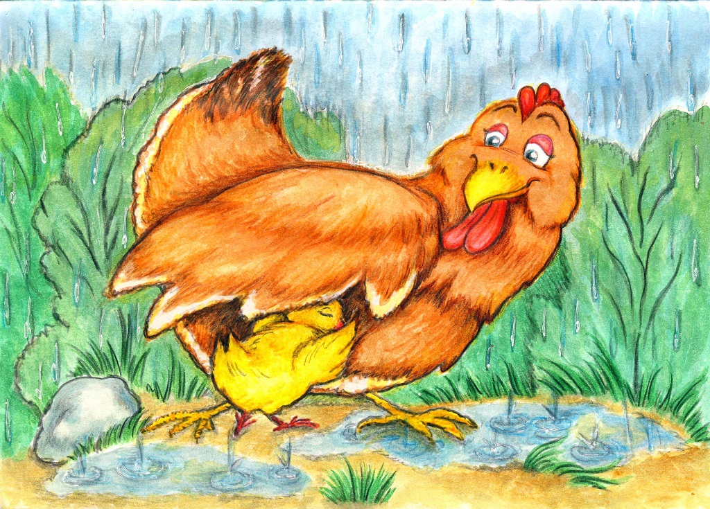 Однажды цыпленок пошел гулять. Он засмотрелся на красивых разноцветных бабочек. Они так забавно порхали вокруг. Цыпленочек не заметил, как ушел далеко от дома. Наконец, он понял это и побрел обратно. Но небо заволокло серыми, неприветливыми тучами. Тут же по листьям, траве и земле стали стучать капли дождя. Озябший цыпленок огляделся вокруг. Куда же спрятаться от дождя?