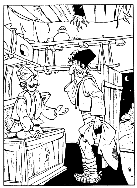 Получив комнату на постоялом дворе, приятели позвали сына хозяина, заказали обильный ужин. Досыта наелись и легли спать.
