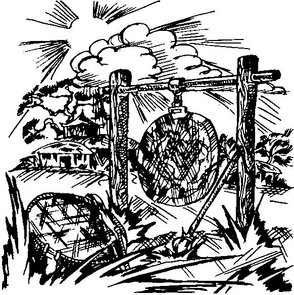 Выхватил бог Идзанаги висевший у него на поясе меч и, отмахиваясь им от преследователей, побежал прочь.