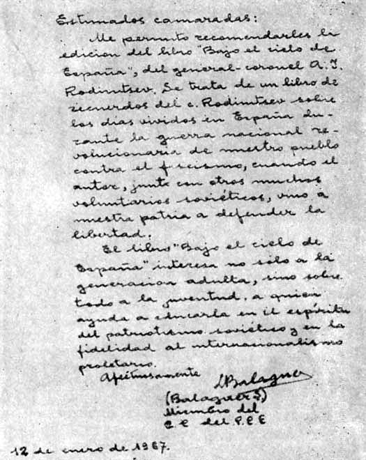 Я позволю себе рекомендовать книгу генерал-полковника Родимцева «Под небом Испании». Эта книга – воспоминания бывшего советского добровольца Родимцева о днях, проведенных им в Испании во время национально-революционной войны испанского народа против фашизма. Тогда он вместе с советскими добровольцами приехал на нашу родину защищать нашу свободу.