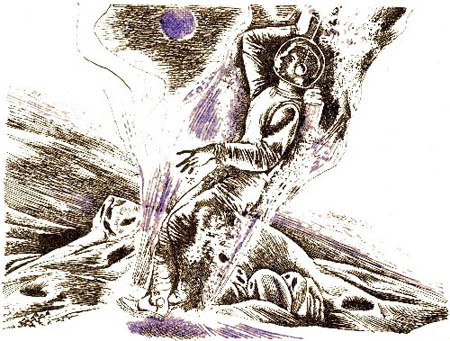 “Черепашка” неторопливо бежала от космодрома, где опустился “Ветер времени”, к станции. Ехали напрямик по бурой, каменистой поверхности, испещренной оспинами небольших плоских кратеров. Справа вдали то появлялся, то исчезал за ближними возвышенностями фиолетово-красный обрыв, окаймленный шлейфами ржавых осыпей. Слева каменистая равнина, постепенно понижаясь, уходила на север и тонула в красноватой, пыльной мгле.