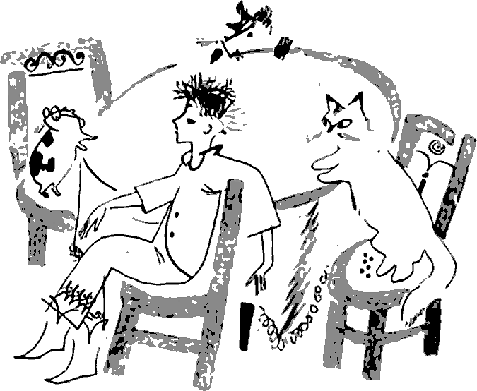 Первым выскочил из картинки Фунтик. Он так и шлепнулся на стол. За ним легко спрыгнул Хандрила. За Хандрилой — Угадай.