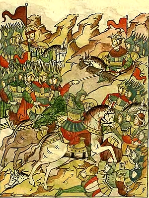 Невская битва. В центре в нимбе — св. князь Александр. Там же. Л. 909 об.