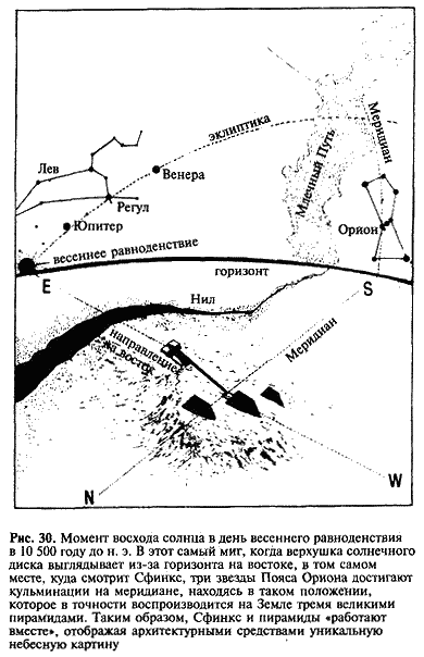 В поисках ответов на эти вопросы мы включились в странную и неожиданную область исследований. Подобно душам, направляющимся в Страну Мертвых, нам приходилось пробираться через темное царство древнеегипетского «того света», прокладывая путь по его узким коридорам, затопленным проходам и скрытым камерам, с тем, чтобы встретиться со злыми духами и демонами, которые там скрываются. Используя компьютерное моделирование, мы совершали путешествие во времени, чтобы оказаться под небесами, какими они были 12 000 лет тому назад, и следить за тем, как Орион пересекает меридиан, а Лев, сверкая, восходит на востоке. Мы погружались в древние тексты, говорящие о возрождении, мифы и рукописи, и находили там замаскированные следы замечательного «астрономического языка», которые, оказывается, можно без особенного труда прочесть и понять даже сегодня.