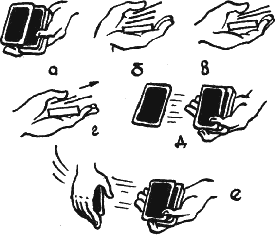 Карты возникают то в одной, то в другой руке – появляются и падают на пол. Престидижитатор вытягивает руки, «берет» карты с воздуха, а затем откидывает их. Он работает четко, уверенно.
